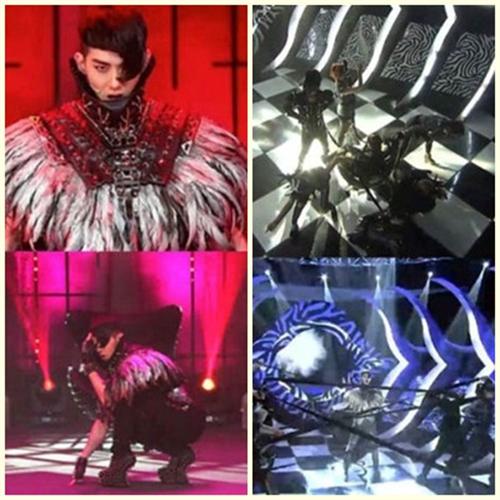 羽毛装饰的独特服饰、而韩国男歌手中最先挑战19.5cm的高跟鞋,造型夸张引人侧目。他冷傲的眼神和眼花缭乱的舞蹈,展现了自己特有的坚强魅力。而通过皮鞭驯服装扮成动物的伴舞的表演,令人叹为观止。