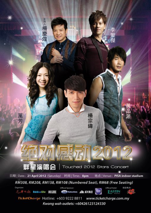 绝对动感2012群星演唱会 日期: 21/04/12 (星期六) 时间: 8pm 地点: PISA Indoor Stadium, Penang 演出歌手: 杨庆煌、李圣杰、品冠、黄品源、万芳、杨宗纬
